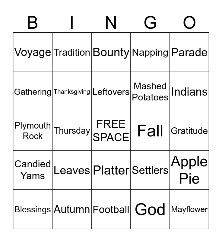 This bingo card has a free space and 29 words: Blessings, November, Thursday, Colony, Voyage, Bounty, Thanksgiving, Leaves, Fall, Autumn, Gratitude, Mayflower, Football, God, Indians, Pilgrim, Platter, Candied Yams, Parade, Plymouth Rock, Settlers, Friends, Mashed Potatoes, Gathering, Napping, Tradition, Apple Pie, Leftovers and Feast.