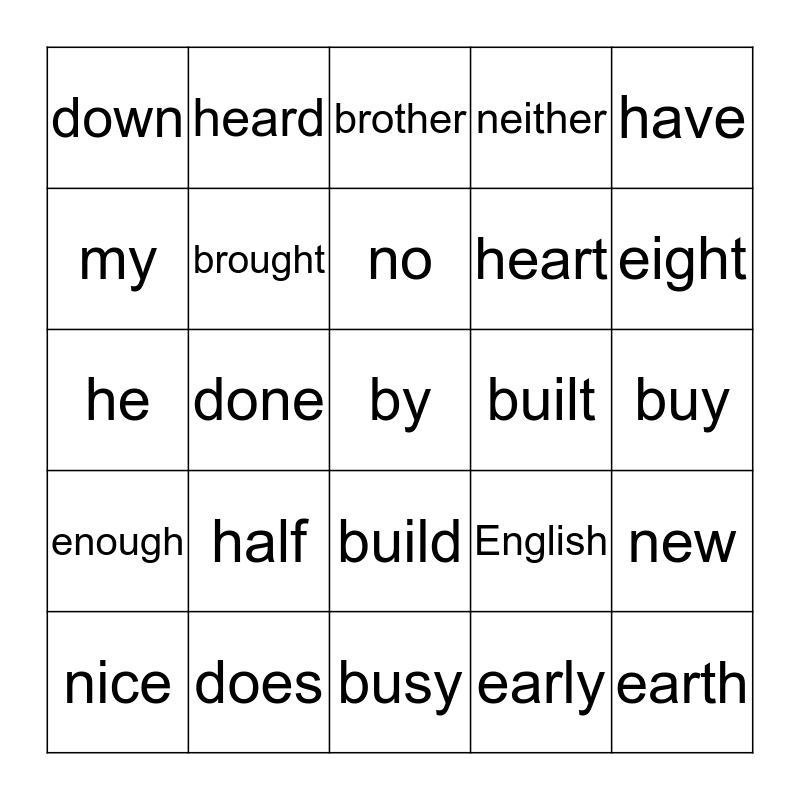 This bingo card has 30 words: does, don’t, done, door, down, brother, brought, build, built, busy, buy, by, early, earth, eight, either, English, enough, half, have, he, head, heard, heart, my, neither, new, nice, no and now.