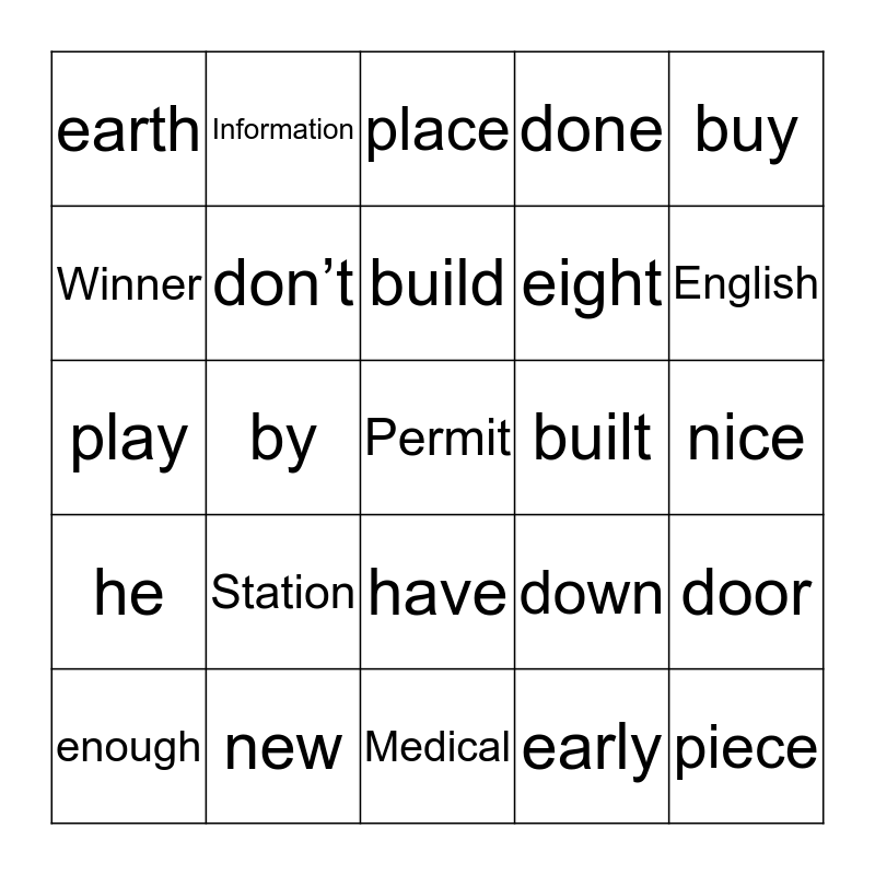 This bingo card has 46 words: Jump, Permit, Perfect, Medical, Station, Jungle, Information, Fiction, Winner, does, don’t, done, door, down, brother, brought, build, built, busy, buy, by, early, earth, eight, either, English, enough, half, have, he, head, heard, heart, my, neither, new, nice, no, now, pie, piece, place, play, pretty, pull and push.
