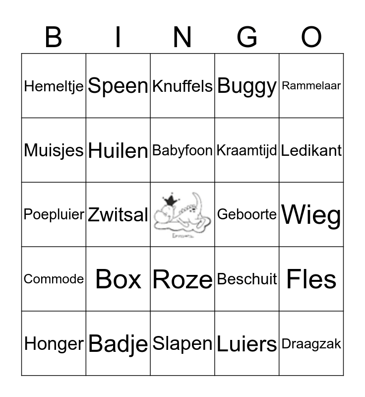 This bingo card has a free space and 24 words: Box, Badje, Babyfoon, Honger, Rammelaar, Hemeltje, Muisjes, Speen, Geboorte, Roze, Kraamtijd, Poepluier, Beschuit, Fles, Huilen, Luiers, Wieg, Knuffels, Ledikant, Zwitsal, Draagzak, Commode, Buggy and Slapen.