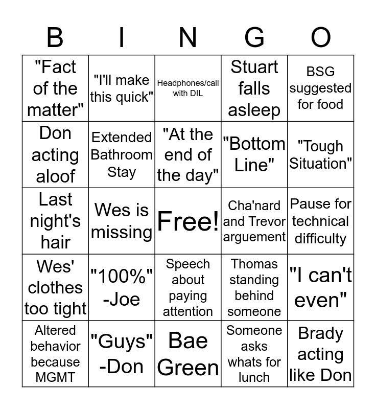This bingo card has a free space and 39 words: Obvious hangover, "If anyone wants to debate", Wes' Wife/Baby Shows Up, Extended Bathroom Stay, Altered behavior because MGMT, Speech about paying attention, "At the end of the day", Bling Ring, BSG suggested for food, Wes' clothes too tight, Wes is missing, Stuart falls asleep, Brady acting like Don, Pause for technical difficulty, Cha'nard and Trevor arguement, "100%" -Joe, "Forecast Accuracy", "Fact of the matter", "Don't want to give anything away", Thomas standing behind someone, Don acting aloof, Bae Green, "Bottom Line", "Tough Situation", "Ain't", Double negatives, Go deep/Dive Deep, "Take this offline", Phrase that could be followed by TWSS, "I'll make this quick", Playing game on laptop/phone, "Get up on it", Headphones/call with DIL, "Guys" -Don, Someone asks whats for lunch, "I'm on top of it" - Joe, "I can't even", Last night's hair and "Having said that".
