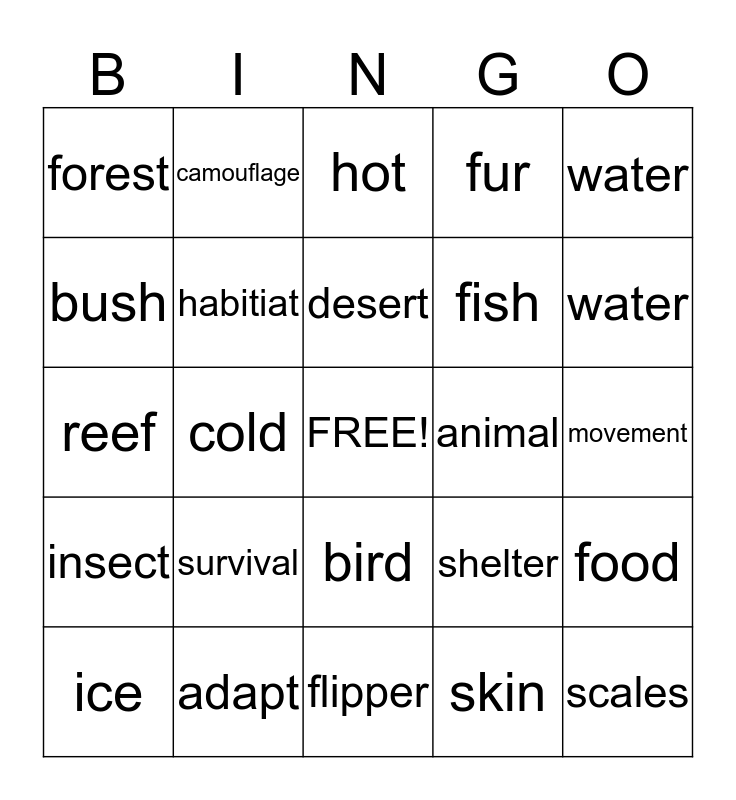 This bingo card has a free space and 24 words: survival, adapt, desert, ice, water, forest, bush, camouflage, animal, bird, fish, reef, shelter, food, habitiat, skin, movement, hot, water, cold, scales, insect, fur and flipper.