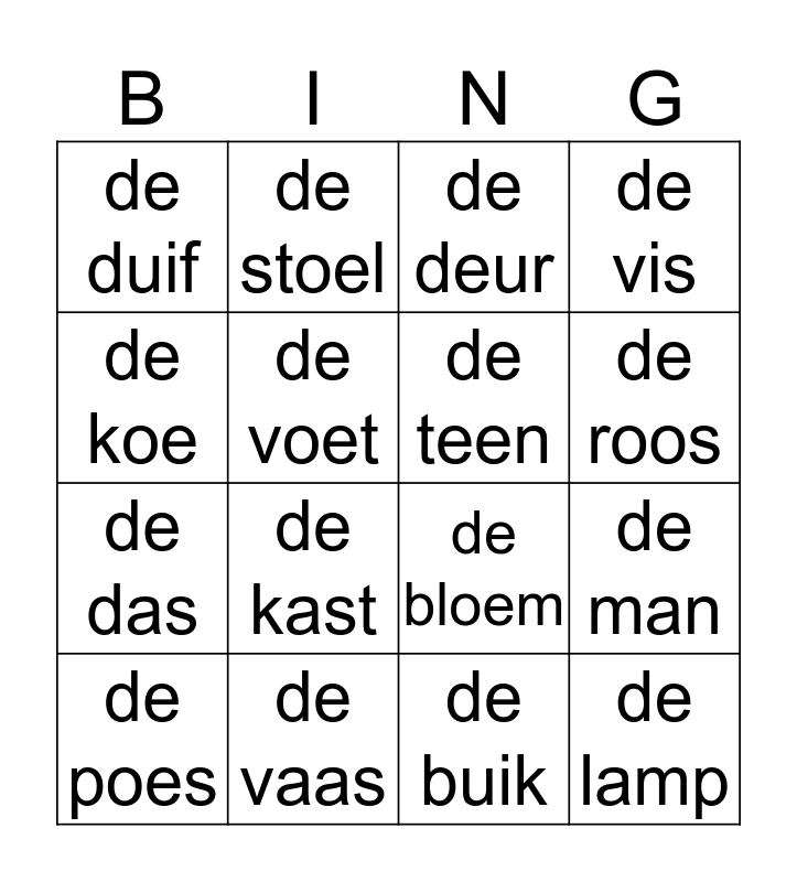 This bingo card has 20 words: de man, de dief, de deur, de doos, de poes, de koe, de vaas, de duif, de das, de stoel, de kast, de bloem, de voet, de lamp, de teen, de maan, de roos, de vis, de buik and de pet.