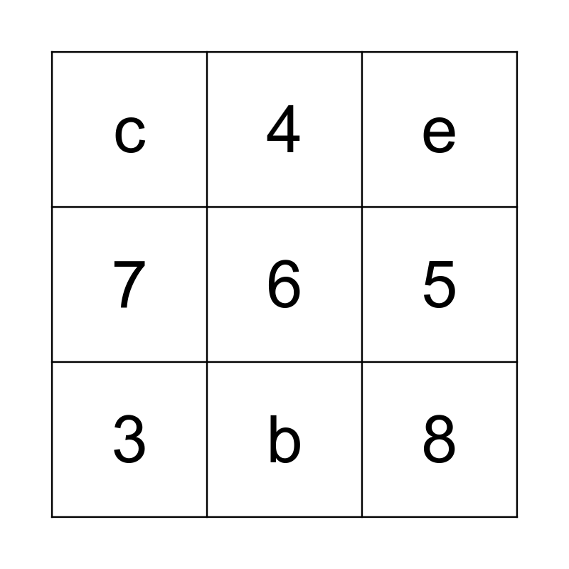 This bingo card has a free space and 14 words: 1, 2, 3, 4, 7, 8, 9, a, b, c, d, 5, e and f.