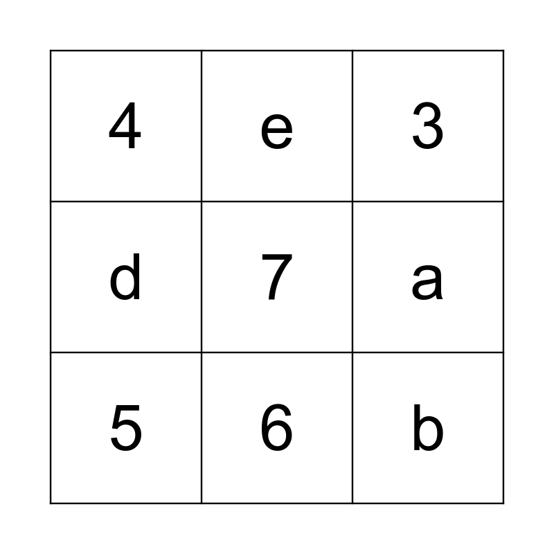 This bingo card has 15 words: 1, 2, 3, 4, 6, 7, 8, 9, a, b, c, d, 5, e and f.