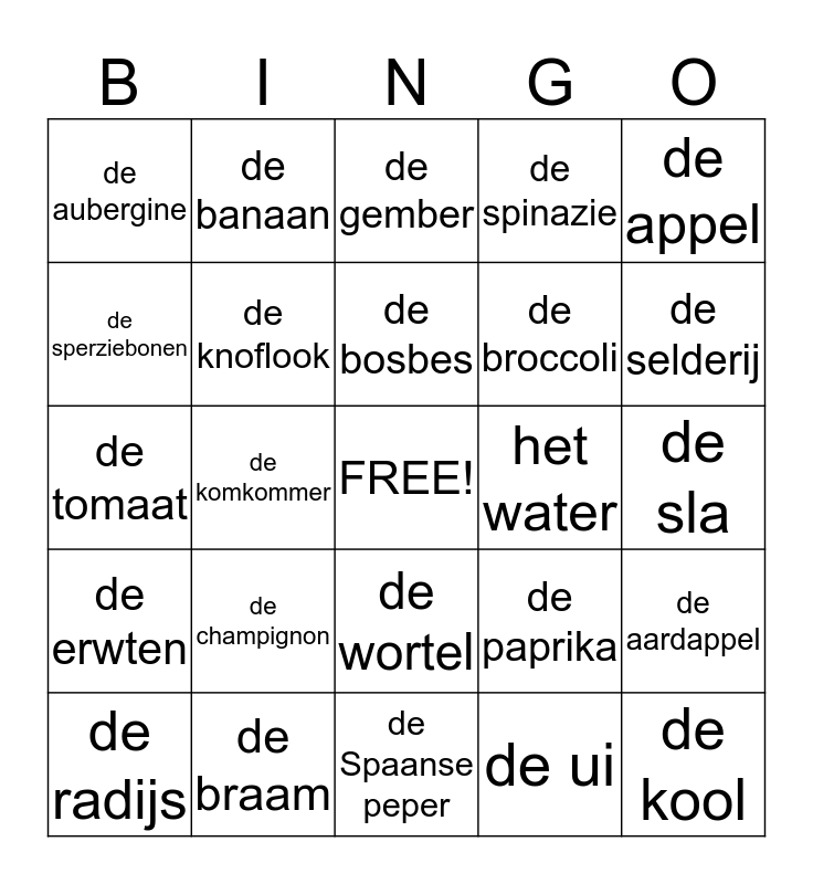 This bingo card has a free space and 24 words: de champignon, de braam, de bosbes, de radijs, de appel, de aubergine, de sperziebonen, de banaan, het water, de wortel, de broccoli, de tomaat, de paprika, de aardappel, de knoflook, de ui, de sla, de gember, de selderij, de komkommer, de kool, de erwten, de spinazie and de Spaanse peper.