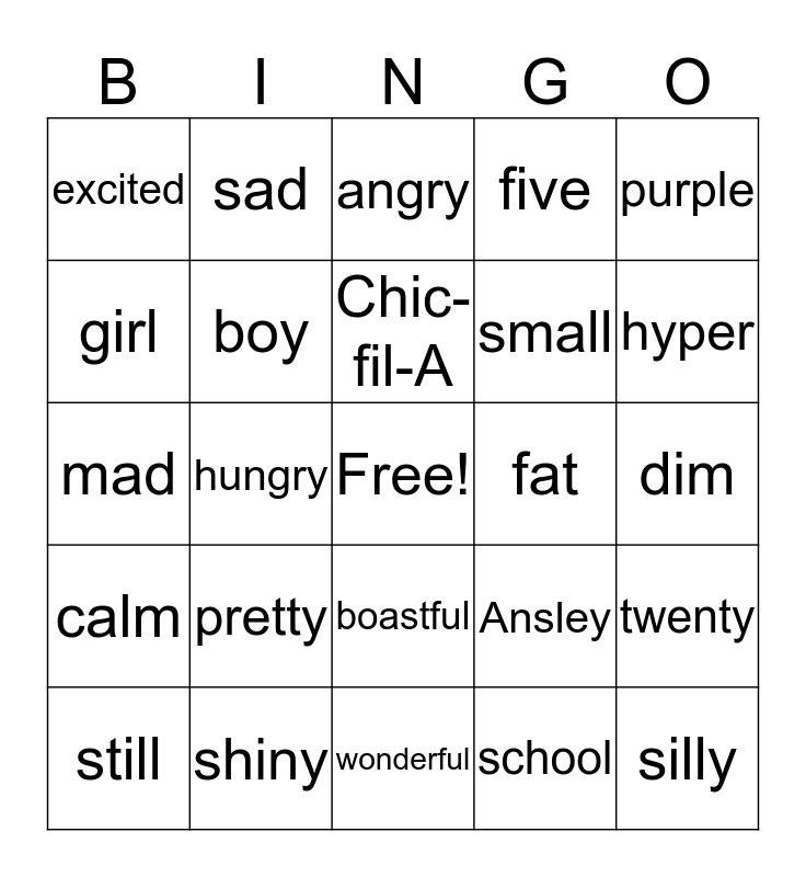 This bingo card has a free space and 49 words: Mrs. Brown, silly, confident, wonderful, pretty, loud, sad, quiet, girl, green, boy, five, twenty, Ansley, carpet, high, Chic-fil-A, fat, long, purple, hungry, school, excited, small, big, hyper, still, bashful, boastful, calm, one, slimy, stinky, hard, shiny, dull, glowing, bright, dim, playful, red, black, little, beautiful, mad, angry, scared, nervous and strong.