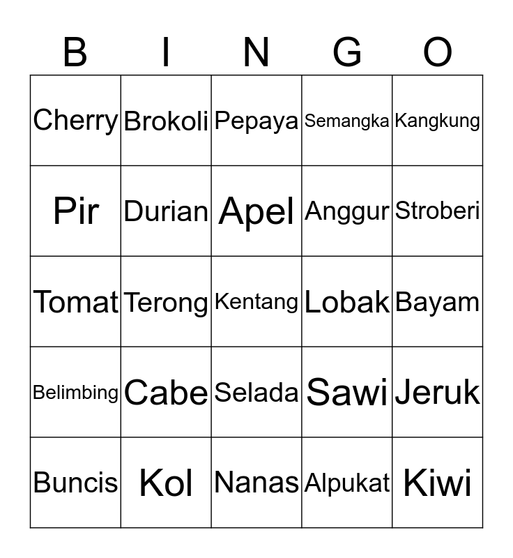 This bingo card has 25 words: Belimbing, Kol, Kentang, Alpukat, Kangkung, Cherry, Brokoli, Pepaya, Lobak, Jeruk, Pir, Durian, Nanas, Sawi, Stroberi, Buncis, Terong, Apel, Anggur, Bayam, Tomat, Cabe, Selada, Semangka and Kiwi.