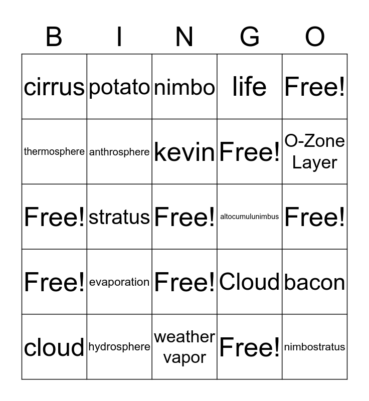 This bingo card has a free space and 29 words: cloud, persipitation, stratus, alto, cirrus, nimbo, anthrosphere, evaporation, altocumulunimbus, hydrosphere, Free!, nimbostratus, weather vapor, Free!, O-Zone Layer, Free!, Free!, Free!, Free!, Free!, Cloud, nimbo, Free!, thermosphere, life, potato, bacon, kevin and batman.