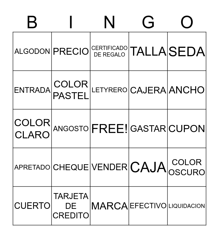 This bingo card has a free space and 24 words: CHEQUE, TARJETA DE CREDITO, LETYRERO, CUERTO, SEDA, ALGODON, ENTRADA, PRECIO, GASTAR, VENDER, CAJERA, COLOR CLARO, CAJA, COLOR OSCURO, COLOR PASTEL, EFECTIVO, CUPON, CERTIFICADO DE REGALO, ANCHO, ANGOSTO, LIQUIDACION, APRETADO, TALLA and MARCA.