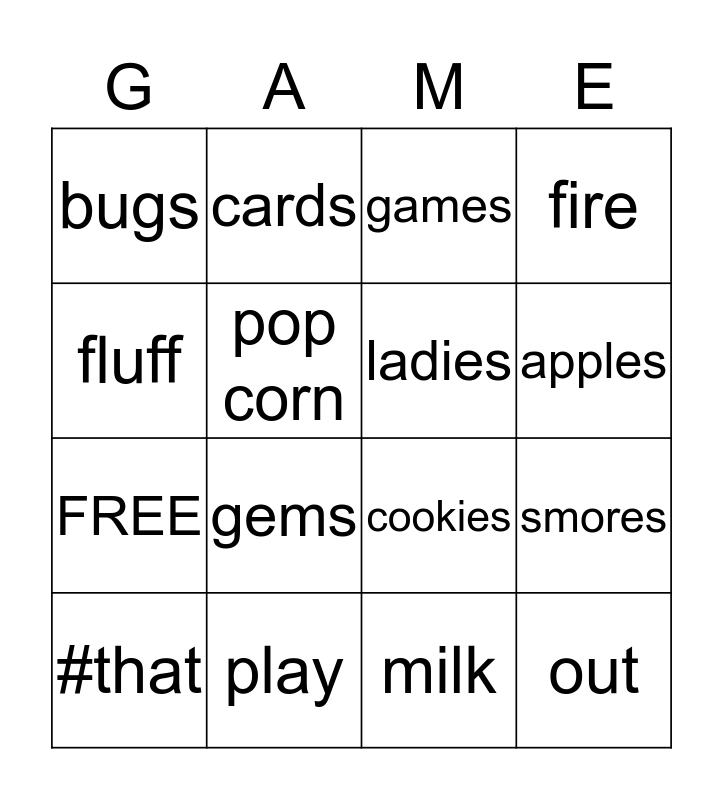 This bingo card has 16 words: #that, play, games, fire, fluff, cards, cookies, smores, bugs, pop corn, milk, apples, FREE, gems, ladies and out.