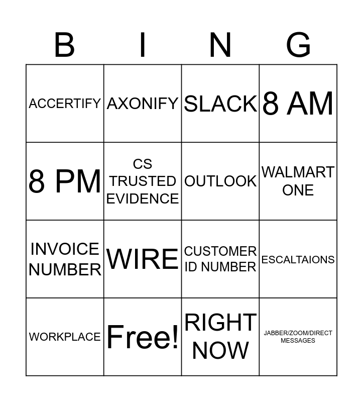 This bingo card has 21 words: Free!, UNO, AXONIFY, VCC, RIGHT NOW, OUTLOOK, ACCERTIFY, SLACK, CUSTOMER ID NUMBER, WALMART ONE, INVOICE NUMBER, 8 AM, JABBER/ZOOM/DIRECT MESSAGES, CS UNATHORIZED USER, CS TRUSTED EVIDENCE, ACCEPT VERIFIED, WORKPLACE, WIRE, 8 PM, ESCALTAIONS and DENY NON FRAUD.