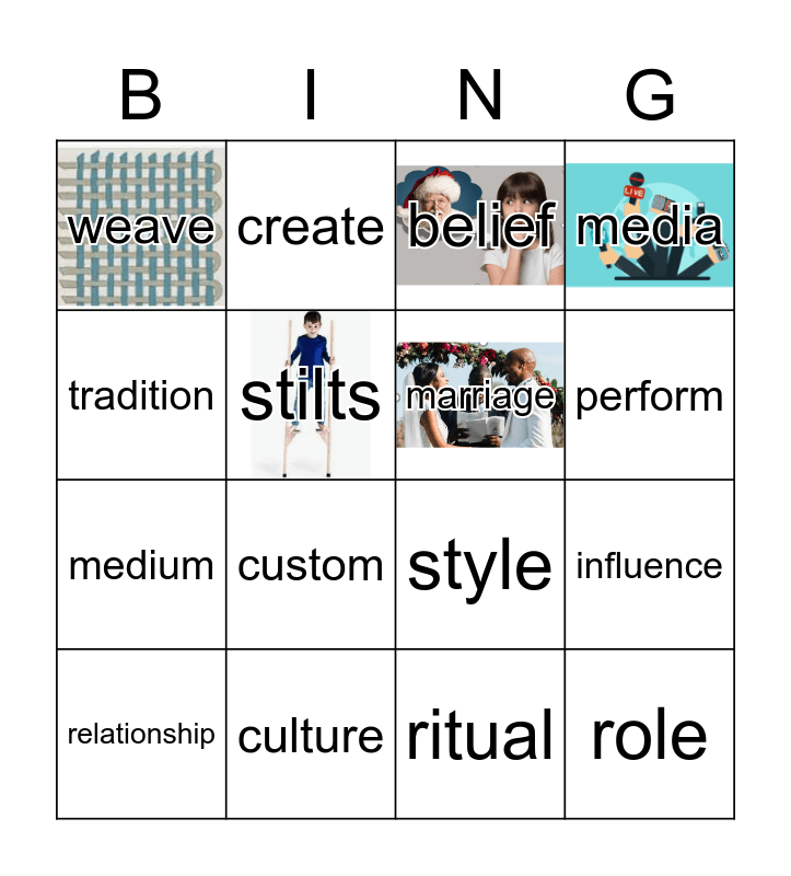 This bingo card has 8 images and 24 words: craft, musical, perform, pottery, tradition, weave, stilts, create, culture, express, medium, style, ancestor, ceremony, marriage, occasion, ritual, belief, custom, influence, relationship, role, media and clarify.