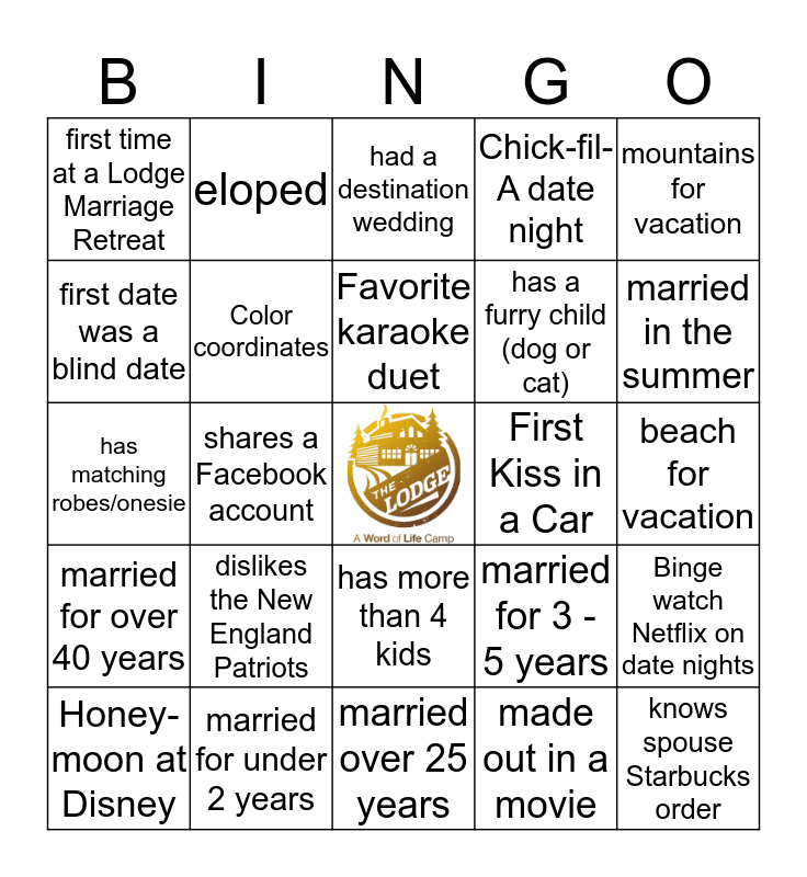 This bingo card has a free space and 29 words: Honey-moon at Disney, motorcycle couple, shares a Facebook account, married in the winter, first time at a Lodge Marriage Retreat, had a destination wedding, Color coordinates, dislikes the New England Patriots, First Kiss in a Car, married for under 2 years, beach for vacation, knows spouse Starbucks order, married over 25 years, made out in a movie, married in the summer, has a custom ringtone for their spouse, has more than 4 kids, married for over 40 years, mountains for vacation, has matching robes/onesie, married for 3 - 5 years, still ashamed to hold wife's purse, has a furry child (dog or cat), first date was a blind date, Chick-fil-A date night, eloped, Binge watch Netflix on date nights, Favorite karaoke duet and couples halloween costume.