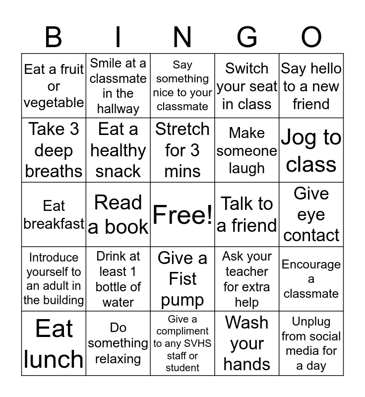 This bingo card has a free space and 24 words: Drink at least 1 bottle of water, Do something relaxing, Stretch for 3 mins, Eat lunch, Say hello to a new friend, Eat a fruit or vegetable, Take 3 deep breaths, Smile at a classmate in the hallway, Talk to a friend, Give a Fist pump, Make someone laugh, Eat breakfast, Ask your teacher for extra help, Encourage a classmate, Eat a healthy snack, Wash your hands, Give eye contact, Say something nice to your classmate, Jog to class, Read a book, Unplug from social media for a day, Introduce yourself to an adult in the building, Switch your seat in class and Give a compliment to any SVHS staff or student.