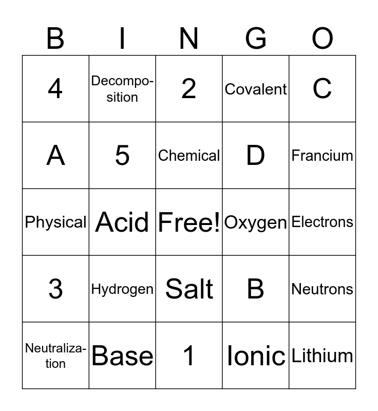 This bingo card has a free space and 24 words: Hydrogen, Base, Chemical, Neutraliza-tion, C, 4, A, Decompo-sition, Oxygen, Salt, D, Physical, B, Neutrons, 5, Ionic, Electrons, 2, Francium, Acid, Lithium, 3, Covalent and 1.