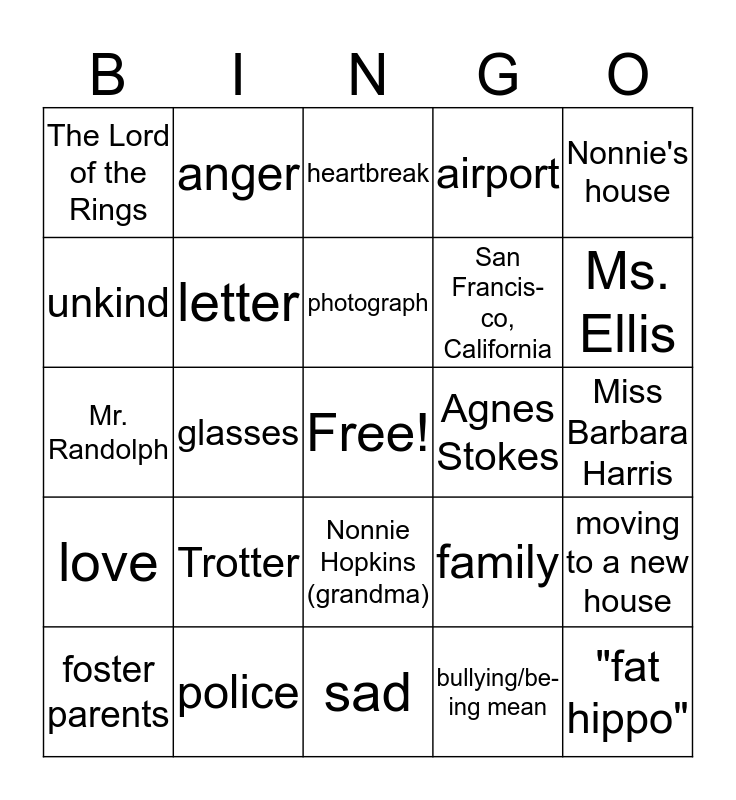 This bingo card has a free space and 27 words: family, Courtney, San Francis-co, California, sad, unkind, heartbreak, anger, love, Agnes Stokes, moving to a new house, Mr. Randolph, airport, foster parents, police, Ms. Ellis, happy, letter, photograph, Trotter, The Lord of the Rings, Miss Barbara Harris, bullying/be-ing mean, glasses, "fat hippo", Nonnie Hopkins (grandma), Nonnie's house and Virginia.