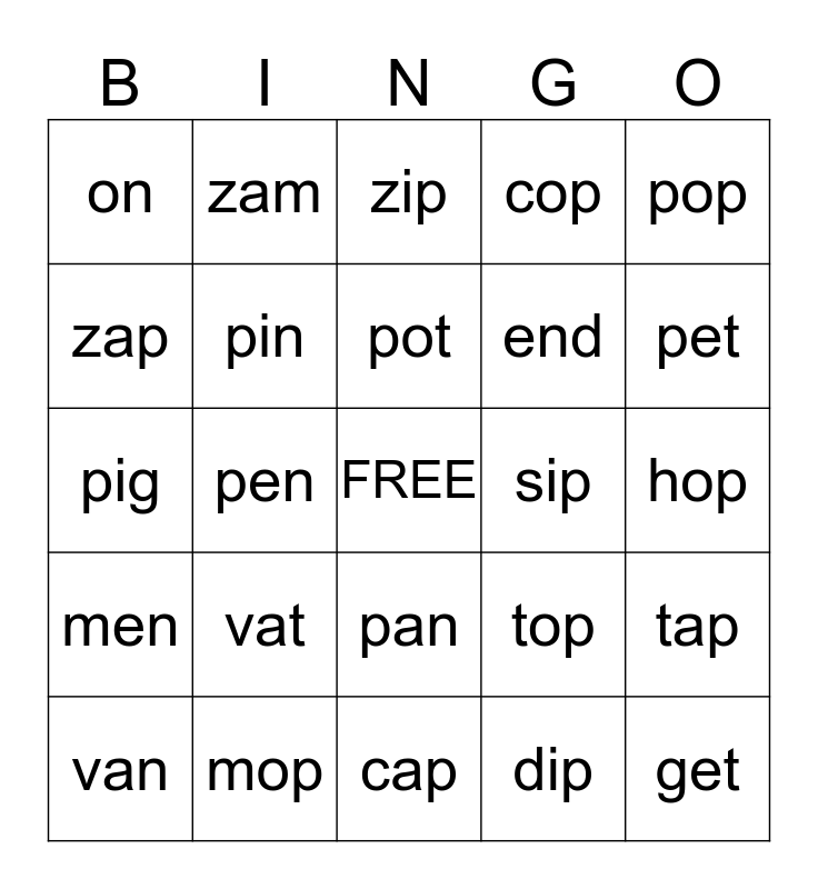 This bingo card has a free space and 24 words: van, vat, pot, dip, pop, on, zam, zip, sip, hop, pig, pin, top, tap, zap, mop, cap, cop, pet, men, pen, pan, end and get.