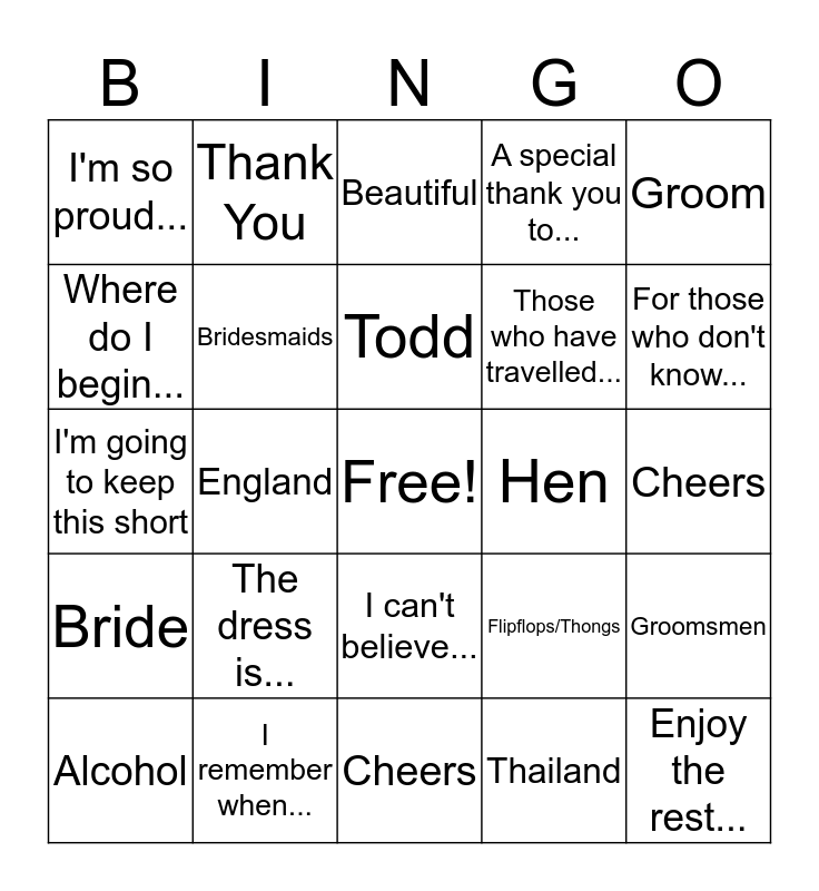 This bingo card has a free space and 32 words: Thailand, Australia, England, London, Bride, Bridesmaids, Groom, Groomsmen, Thank You, Katherine/Kat, Todd, Beautiful, Flowers, Stag, Hen, Army, Alcohol, I'm going to keep this short, I can't believe..., The dress is..., Flipflops/Thongs, Raise a glass, Cheers, I remember when..., Enjoy the rest..., A special thank you to..., Those who have travelled..., Where do I begin..., I'm so proud..., Cheers, I'm sure you'll agree... and For those who don't know....
