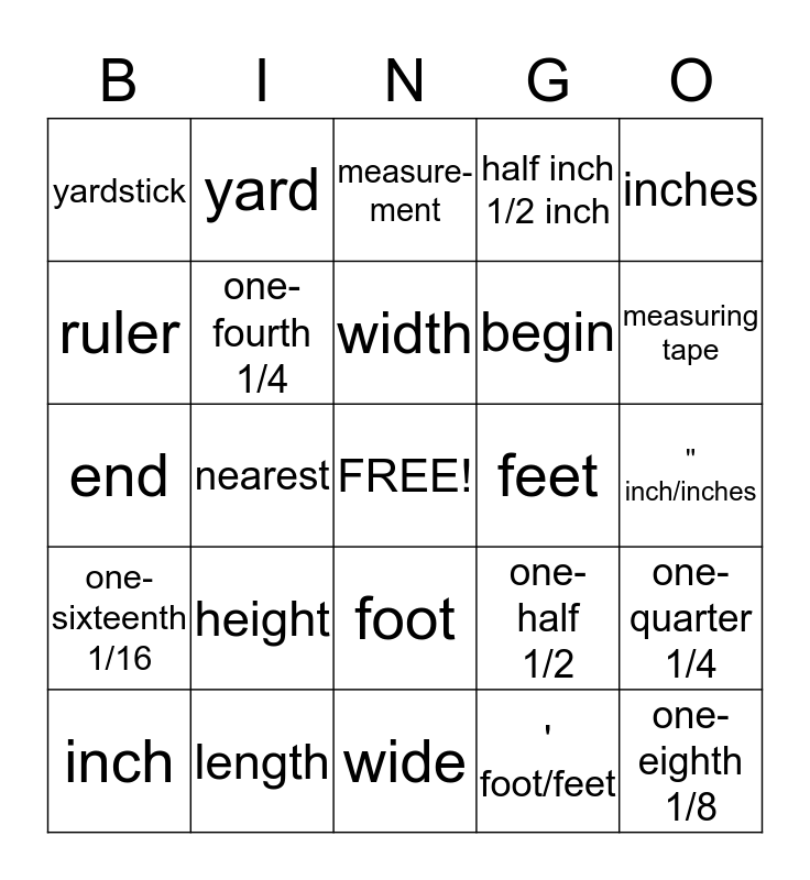 This bingo card has a free space and 24 words: height, length, width, inch, inches, yardstick, ruler, yard, feet, foot, begin, end, one-half 1/2, one-quarter 1/4, one-fourth 1/4, ' foot/feet, '' inch/inches, measure-ment, measuring tape, nearest, one-eighth 1/8, one-sixteenth 1/16, half inch 1/2 inch and wide.