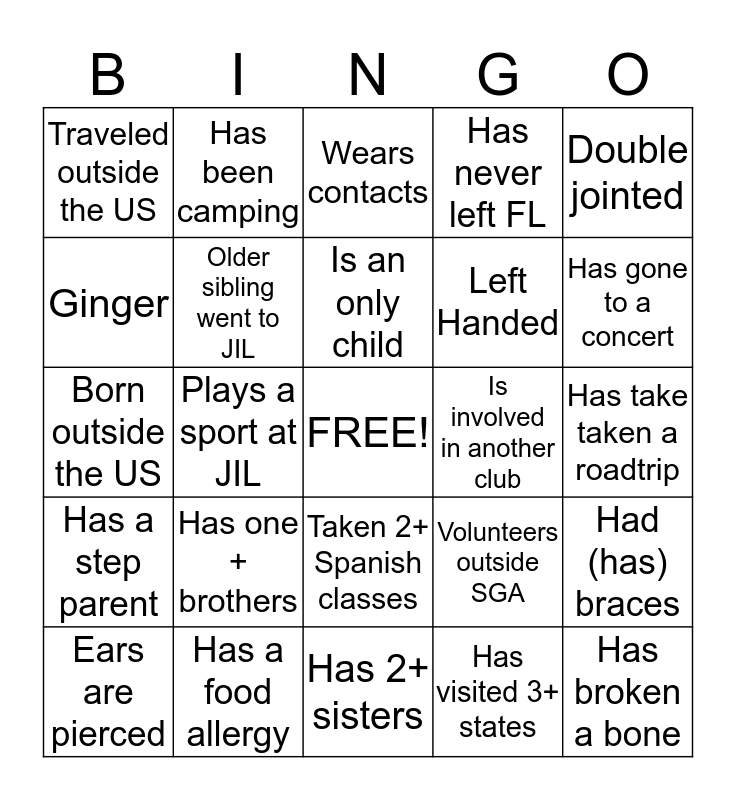 This bingo card has a free space and 24 words: Has one + brothers, Has a food allergy, Is an only child, Ears are pierced, Double jointed, Traveled outside the US, Ginger, Has been camping, Is involved in another club, Taken 2+ Spanish classes, Left Handed, Born outside the US, Volunteers outside SGA, Had (has) braces, Older sibling went to JIL, Has visited 3+ states, Has take taken a roadtrip, Wears contacts, Has gone to a concert, Plays a sport at JIL, Has broken a bone, Has a step parent, Has never left FL and Has 2+ sisters.