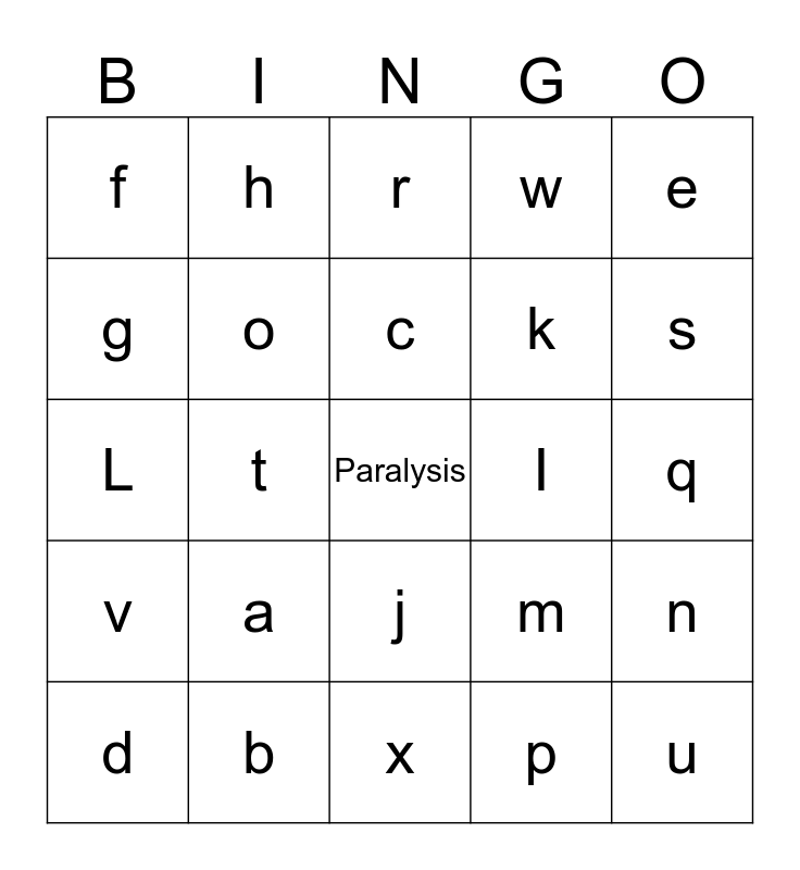 This bingo card has a free space and 24 words: a, b, c, d, e, f, g, h, I, j, k, L, m, n, o, p, q, r, s, t, u, v, w and x.