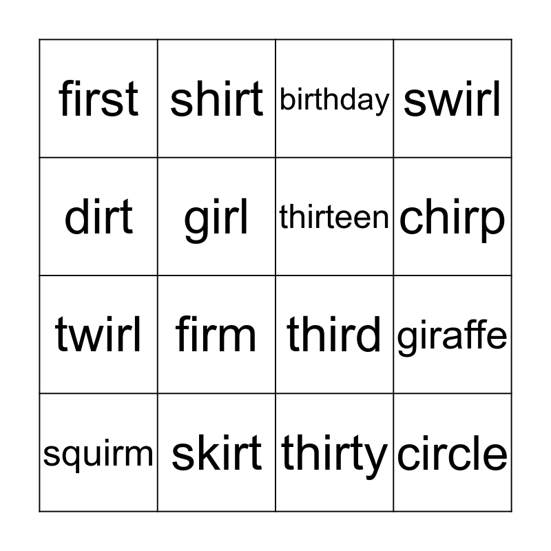 This bingo card has 24 words: bird, birth, chirp, circus, dirt, first, girl, shirt, skirt, stir, twirl, third, Free!, whirl, thirteen, thirst, thirty, birthday, firm, giraffe, squirm, circle, swirl and sir.