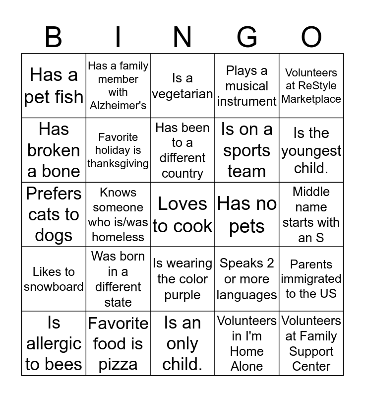 This bingo card has 25 words: Was born in a different state, Is an only child., Has been to a different country, Is allergic to bees, Volunteers at ReStyle Marketplace, Has a pet fish, Has broken a bone, Has a family member with Alzheimer's, Has no pets, Is wearing the color purple, Is on a sports team, Prefers cats to dogs, Speaks 2 or more languages, Parents immigrated to the US, Favorite holiday is thanksgiving, Volunteers at Family Support Center, Middle name starts with an S, Is a vegetarian, Is the youngest child., Knows someone who is/was homeless, Loves to cook, Favorite food is pizza, Likes to snowboard, Plays a musical instrument and Volunteers in I'm Home Alone.