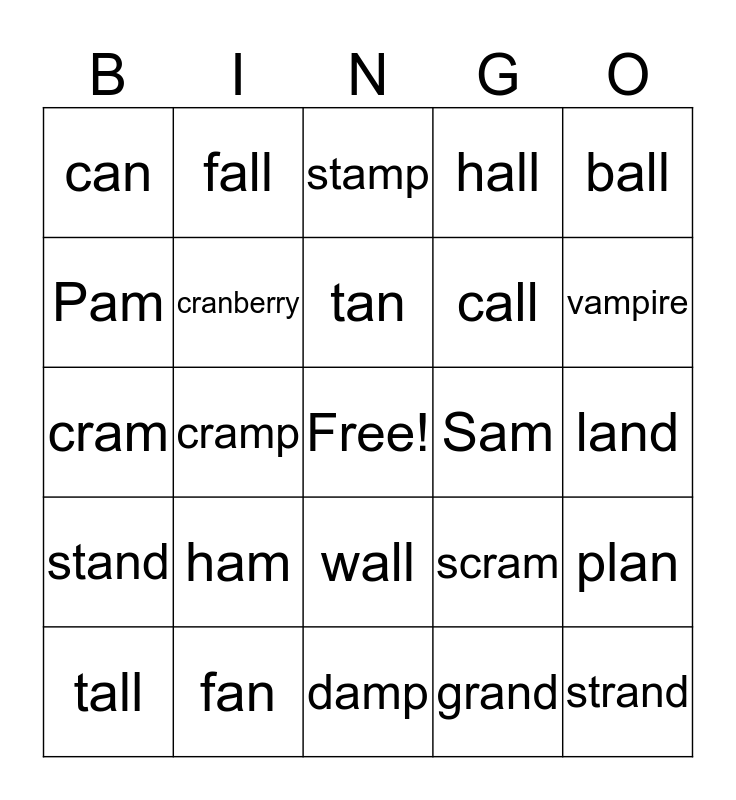 This bingo card has a free space and 24 words: ham, fan, tan, tall, ball, can, Pam, fall, Sam, wall, call, cram, scram, plan, cranberry, grand, land, stamp, vampire, cramp, strand, stand, hall and damp.