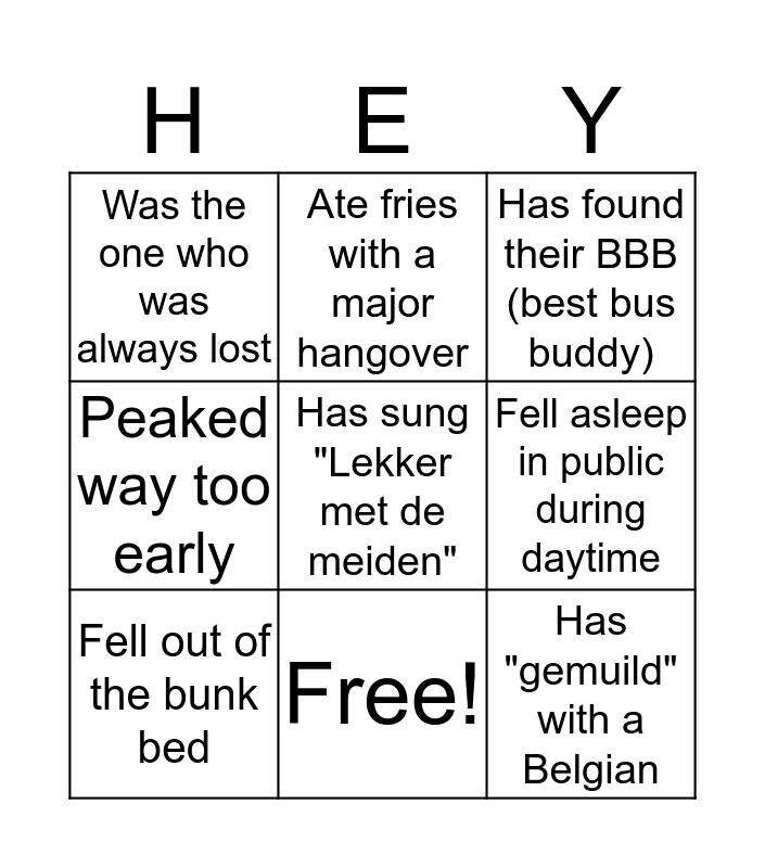 This bingo card has 9 words: Fell out of the bunk bed, Has found their BBB (best bus buddy), Ate fries with a major hangover, Peaked way too early, Was the one who was always lost, Fell asleep in public during daytime, Has sung "Lekker met de meiden", Has "gemuild" with a Belgian and Free!.