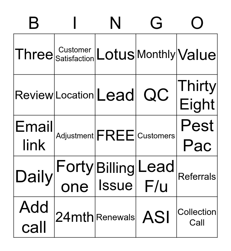 This bingo card has a free space and 24 words: Forty one, 24mth, Lead, Add call, Value, Three, Review, Customer Satisfaction, Customers, Billing Issue, QC, Email link, Lead F/u, Referrals, Location, ASI, Pest Pac, Lotus, Thirty Eight, Adjustment, Collection Call, Daily, Monthly and Renewals.