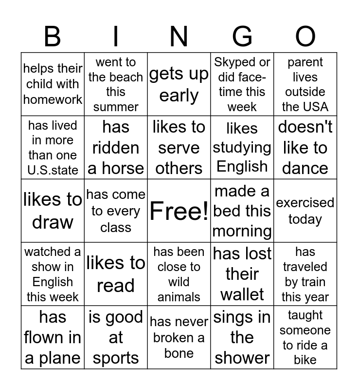 This bingo card has a free space and 64 words: has visited two or more continents, Is a parent, has driven a big truck, has traveled by train this year, visited with the sisters this week, likes their job, went to the beach this summer, taught kids their native language, likes to serve others, had a medical appt. this month, has been close to wild animals, arrives on time to class, exercised today, parent lives outside the USA, has a long drive to work, has lived in more than one U.S.state, has come to every class, helps their child with homework, has made a new friend this month, likes studying English, likes to read, watched a show in English this week, Skyped or did face-time this week, ate a healthy breakfast, loves the rain, works hard on language learning goals, is trying for a better job, likes trying new food, likes to hike, wants to travel, rescued an animal, has climbed a tree, has coached a sport, has ridden on a motorcycle, doesn't like to dance, has flown in a plane, has traveled by ship, sings in the shower, owns a cowboy hat, has ridden a horse, likes to draw, made a bed this morning, has driven manual trans-mission, went to the movie theater this summer, likes bowling, taught someone to ride a bike, is good at sports, likes to swim, has lost their wallet, has seen a whale, has shot a bow and arrow, has milked a cow, has never broken a bone, was named after a family member, is happy, works hard, gets up early, is religious, has slept under the stars, has made a snowman, has changed a tire, sneezes loudly, has had an operation and has never had a traffic ticket.