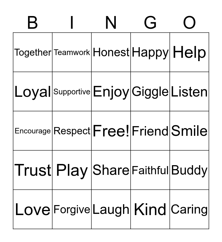 This bingo card has a free space and 24 words: Play, Forgive, Enjoy, Love, Help, Together, Loyal, Teamwork, Friend, Share, Giggle, Encourage, Faithful, Buddy, Supportive, Kind, Smile, Honest, Listen, Respect, Caring, Trust, Happy and Laugh.