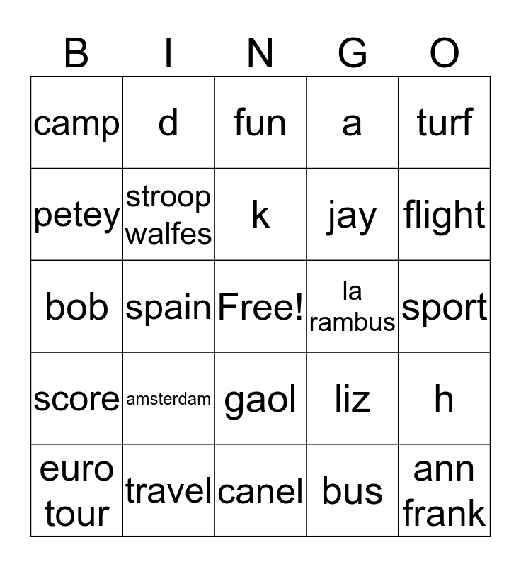 This bingo card has a free space and 29 words: euro tour, dutch, spain, hockey, camp, fun, stroop walfes, amsterdam, la rambus, travel, sport, ann frank, canel, bus, flight, team, gaol, score, turf, bob, liz, tori, jay, petey, a, d, h, k and l.