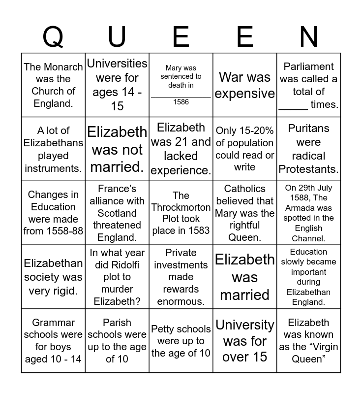 This bingo card has 36 words: Free!, Elizabeth became Queen in 1558., Elizabeth was a Protestant., Elizabeth was not married., Elizabeth was married, Elizabethan society was very rigid., Elizabeth was 21 and lacked experience., How much was The Crown in debt?, Parliament was called a total of _____ times., Frances had ended war with Spain., France’s alliance with Scotland threatened England., War was expensive, England lost Calais to France., Catholics believed that Mary was the rightful Queen., Puritans were radical Protestants., The Monarch was the Church of England., Elizabeth was known as the “Virgin Queen”, In what year did Ridolfi plot to murder Elizabeth?, The Throckmorton Plot took place in 1583, Mary was sentenced to death in _______________ 1586, On 29th July 1588, The Armada was spotted in the English Channel., Education slowly became important during Elizabethan England., Parish schools were up to the age of 10, Grammar schools were for boys aged 10 - 14, Petty schools were up to the age of 10, Universities were for ages 14 - 15, Changes in Education were made from 1558-88, Many girls received no formal education. Reason?, Only 15-20% of population could read or write, A lot of Elizabethans played instruments., Comedians were very popular. Reason?, Sir Francis Drake made profit when he circumnavigated the globe. How Much?, University was for over 15, Private investments made rewards enormous., Walter Raleigh was a Nobleman & Courtier. and Virginia failed because of ____________?.