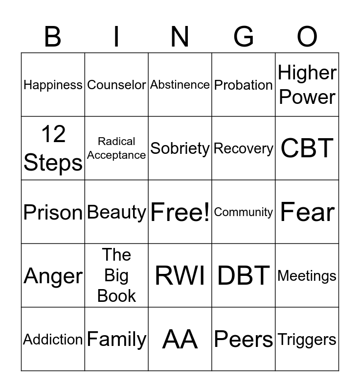 This bingo card has a free space and 29 words: Addiction, Amends, Beauty, Health, Happiness, Abstinence, Radical Acceptance, The Big Book, Community, Family, Fear, Triggers, AA, Peers, CBT, Negativity, RWI, Anger, Higher Power, Prison, DBT, NA, Recovery, 12 Steps, Probation, Counselor, Meetings, Sobriety and Sponsor.