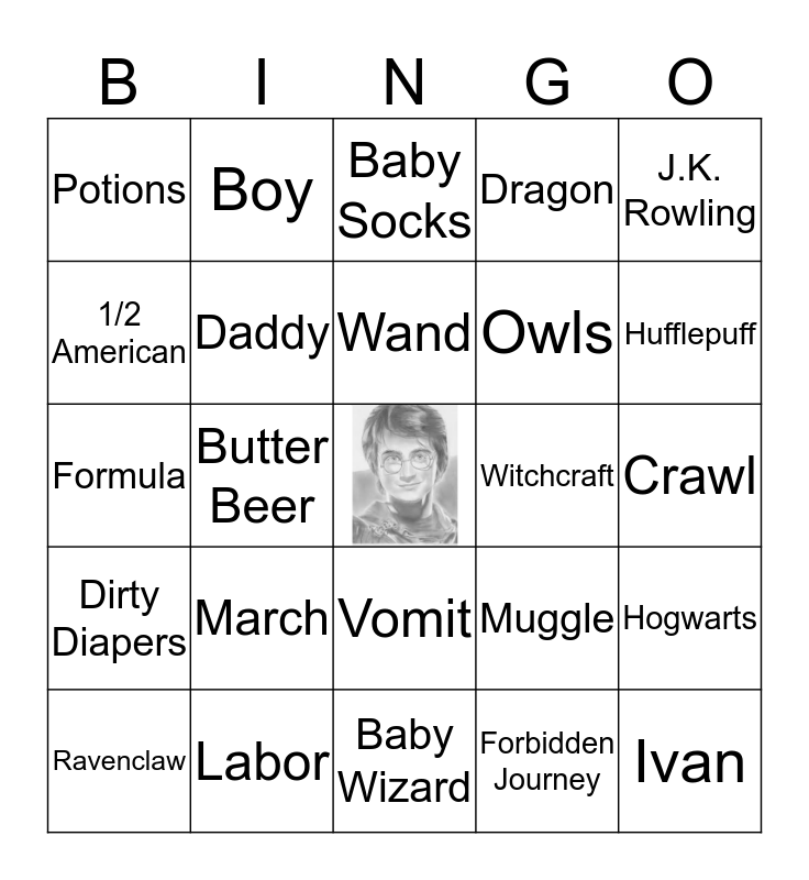 This bingo card has a free space and 46 words: James, Ivan, Reynolds, Baby Wizard, March, 2019, Boy, 1/2 Russian, 1/2 American, Mommy, Daddy, Dragon, Hogwarts, Muggle, Invisible, Sorting Hat, Wand, Witchcraft, Wizardry, J.K. Rowling, Butter Beer, Forbidden Journey, Potions, Owls, Gryfindor, Hufflepuff, Ravenclaw, Slytherin, Vomit, Dirty Diapers, Bottles, Crying, Cooing, Cuddling, Sleepless Nights, Labor, Crawl, Crib, Pacifier, Burp Cloth, Hooded Towel, Baby Socks, Formula, Baby Powder, Baby Lotion and Diaper Bag.