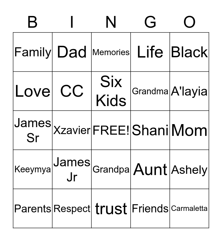 This bingo card has a free space and 24 words: James Jr, Respect, Six Kids, Parents, Black, Family, Love, Dad, Shani, Grandpa, Grandma, James Sr, Aunt, Ashely, CC, Friends, Mom, Memories, A'layia, Xzavier, Carmaletta, Keeymya, Life and trust.