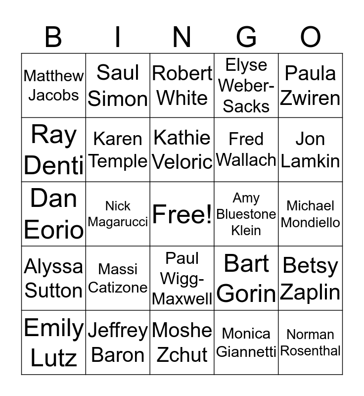 This bingo card has a free space and 27 words: Bart Gorin, Casey Holstein, Fred Wallach, Moshe Zchut, Ray Denti, Robert White, Saul Simon, Alyssa Sutton, Amy Bluestone Klein, Betsy Zaplin, Dan Eorio, Elyse Weber-Sacks, Emily Lutz, Jeffrey Baron, Jon Lamkin, Jordan Kaplan, Karen Temple, Kathie Veloric, Massi Catizone, Matthew Jacobs, Michael Mondiello, Monica Giannetti, Nick Magarucci, Norman Rosenthal, Paul Wigg-Maxwell, Paula Zwiren and Philip Seaver.