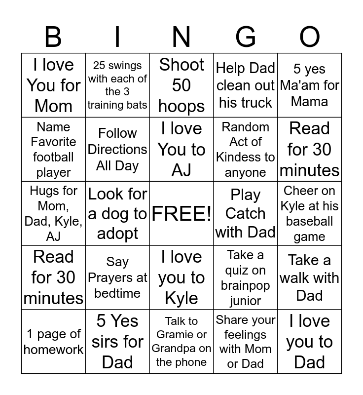This bingo card has a free space and 24 words: Say Prayers at bedtime, 5 Yes sirs for Dad, I love You to AJ, 1 page of homework, 5 yes Ma'am for Mama, I love You for Mom, Name Favorite football player, 25 swings with each of the 3 training bats, Play Catch with Dad, I love you to Kyle, Random Act of Kindess to anyone, Hugs for Mom, Dad, Kyle, AJ, Take a quiz on brainpop junior, Take a walk with Dad, Follow Directions All Day, Share your feelings with Mom or Dad, Cheer on Kyle at his baseball game, Shoot 50 hoops, Read for 30 minutes, Look for a dog to adopt, I love you to Dad, Read for 30 minutes, Help Dad clean out his truck and Talk to Gramie or Grandpa on the phone.