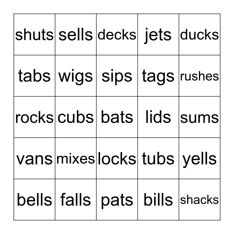 This bingo card has 45 words: backs, bats, cans, bells, chips, bills, decks, checks, ducks, falls, jets, lids, locks, mixes, passes, pats, pets, rocks, rubs, rushes, sells, ships, shops, shuts, sits, sums, tells, tops, tubs, vans, wins, yells, buds, chats, chops, cubs, hums, bashes, shacks, sips, tabs, tags, wags, wigs and zips.
