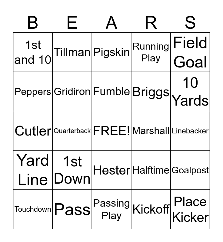 This bingo card has a free space and 24 words: 1st Down, Pass, Fumble, Touchdown, Field Goal, 1st and 10, Peppers, Tillman, Marshall, Hester, Briggs, Cutler, Halftime, Goalpost, Gridiron, Kickoff, Linebacker, Pigskin, 10 Yards, Quarterback, Place Kicker, Yard Line, Running Play and Passing Play.