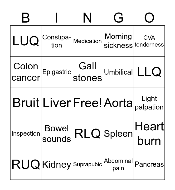 This bingo card has a free space and 29 words: RUQ, Percussion, Liver, Deep palpation, LUQ, Medication, Epigastric, Bowel sounds, Aorta, Kidney, Light palpation, Pancreas, Suprapubic, Abdominal pain, LLQ, Appetite, RLQ, Inspection, CVA tenderness, Bruit, Spleen, Bowel habits, Umbilical, Colon cancer, Morning sickness, Constipa-tion, Heart burn, Gall stones and Abdominal surgery.