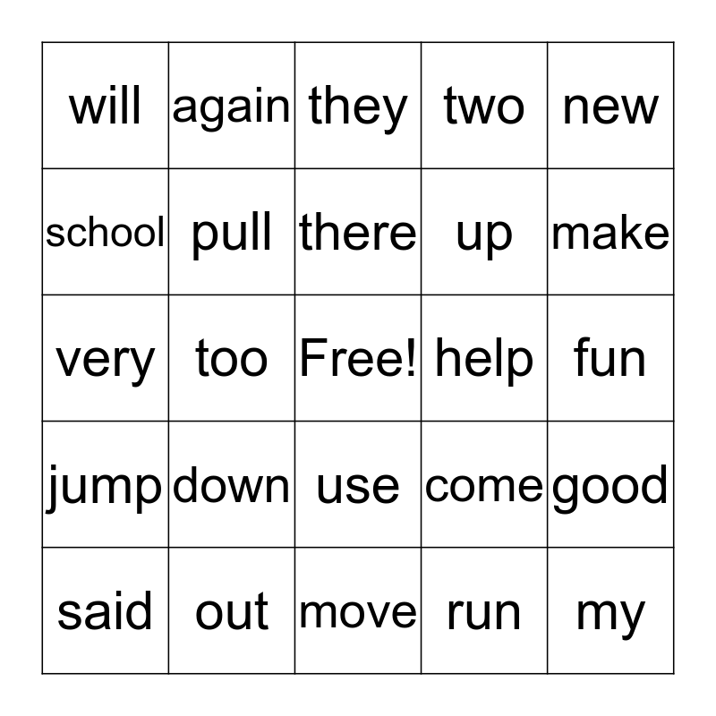 This bingo card has a free space and 24 words: down, out, there, said, new, will, school, again, help, use, up, very, come, good, pull, run, fun, they, make, too, my, jump, two and move.