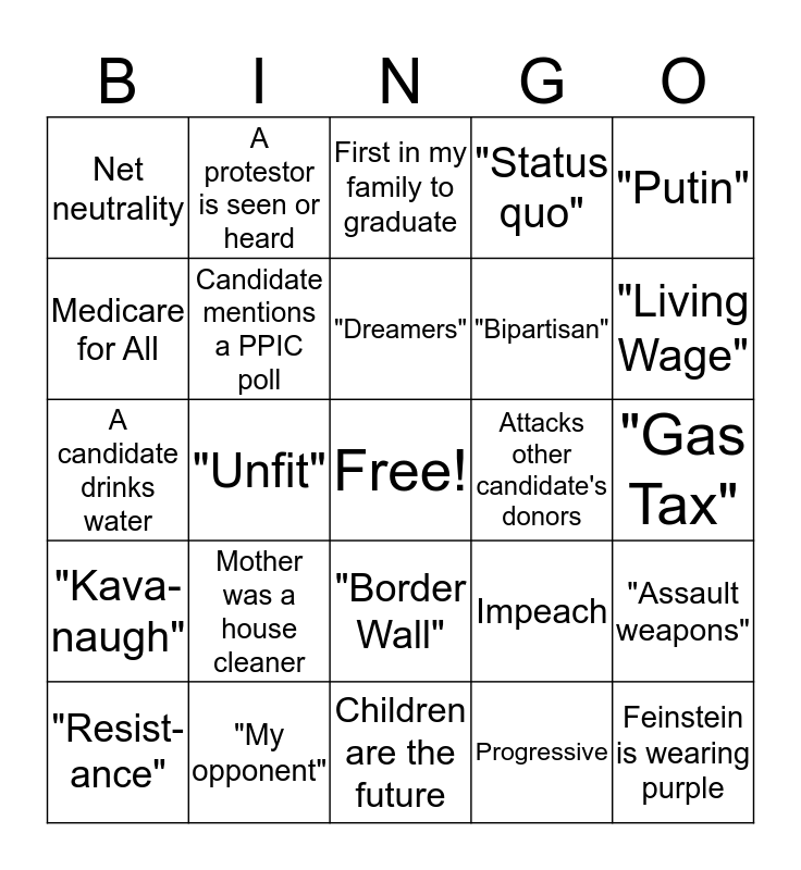 This bingo card has a free space and 24 words: Mother was a house cleaner, "My opponent", "Dreamers", "Resist-ance", "Putin", Net neutrality, Medicare for All, A protestor is seen or heard, Attacks other candidate's donors, "Border Wall", "Bipartisan", A candidate drinks water, Impeach, "Assault weapons", Candidate mentions a PPIC poll, Progressive, "Gas Tax", First in my family to graduate, "Living Wage", "Unfit", Feinstein is wearing purple, "Kava-naugh", "Status quo" and Children are the future.