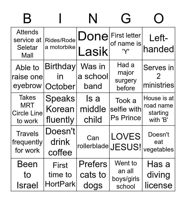 This bingo card has 25 words: Doesn't drink coffee, Prefers cats to dogs, Was in a school band, Been to Israel, Left-handed, Attends service at Seletar Mall, Able to raise one eyebrow, Rides/Rode a motorbike, Took a selfie with Ps Prince, Can rollerblade, Had a major surgery before, Takes MRT Circle Line to work, LOVES JESUS!, Doesn't eat vegetables, Birthday in October, Has a diving license, House is at road name starting with 'B', Done Lasik, Serves in 2 ministries, Speaks Korean fluently, Is a middle child, First time to HortPark, Travels frequently for work, First letter of name is 'Y' and Went to an all boys/girls school.
