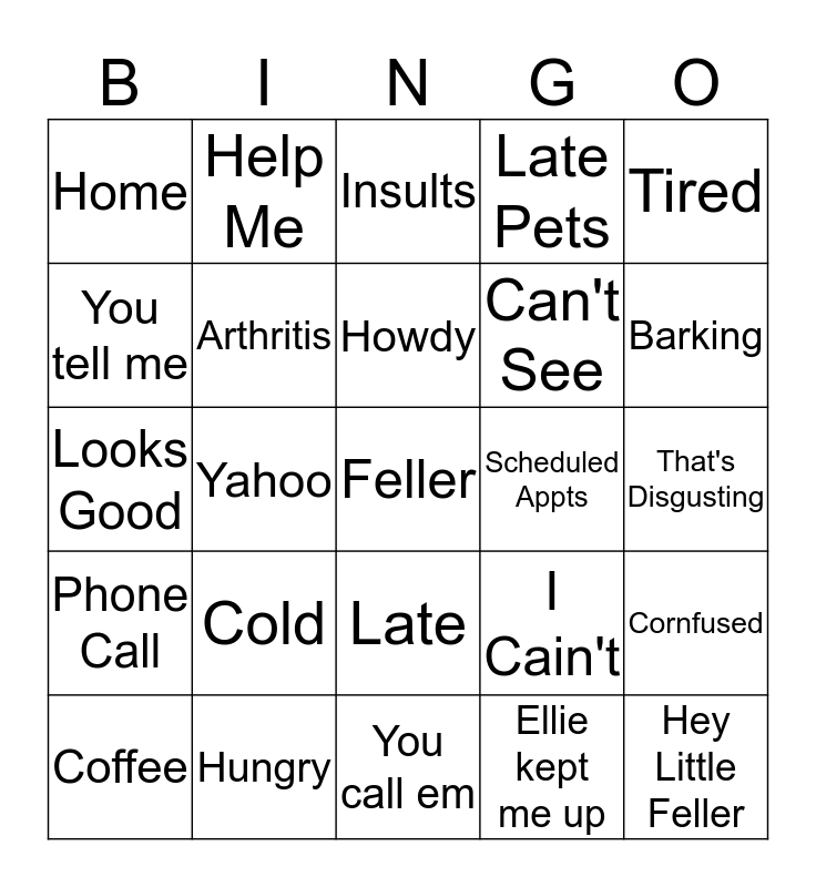 This bingo card has a free space and 24 words: Cold, Hungry, Howdy, Coffee, Tired, Home, You tell me, Help Me, Scheduled Appts, Late, Can't See, Looks Good, I Cain't, Cornfused, Arthritis, Ellie kept me up, That's Disgusting, Insults, Barking, Yahoo, Hey Little Feller, Phone Call, Late Pets and You call em.