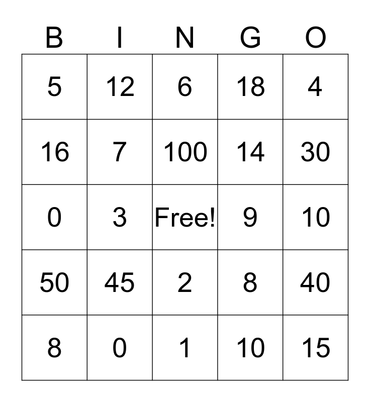 This bingo card has a free space and 31 words: 1, 2, 3, 4, 5, 6, 7, 8, 9, 10, 10, 15, 20, 25, 30, 35, 40, 45, 50, 2, 4, 6, 8, 12, 14, 16, 18, 0, 0, 100 and 100.