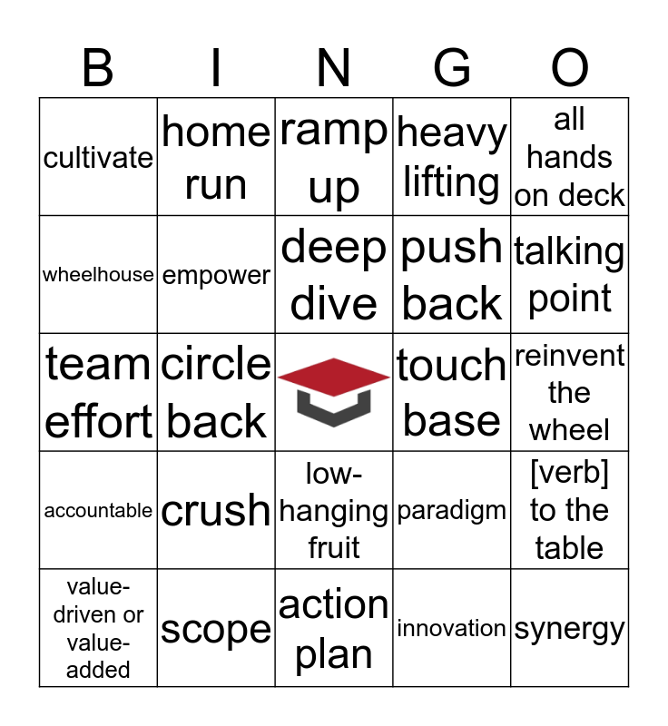 This bingo card has a free space and 47 words: leverage, synergy, TOMO, action plan, crush, silky, home run, disruption, wheelhouse, bandwidth, empower, heavy lifting, [verb] to the table, paradigm, best practice, game-changer, deep dive, touch base, radar, all hands on deck, circle back, innovation, cultivate, push back, scale/scalable, talking point, value-driven or value-added, win-win, low-hanging fruit, accountable, outside the box, drill down, tee up, strategic initiative, facetime, scope, reinvent the wheel, align, silo, testimony, jumpstart, ramp up, team effort, skate to the puck, hashtag, give yourself round of applause and [technical issue].