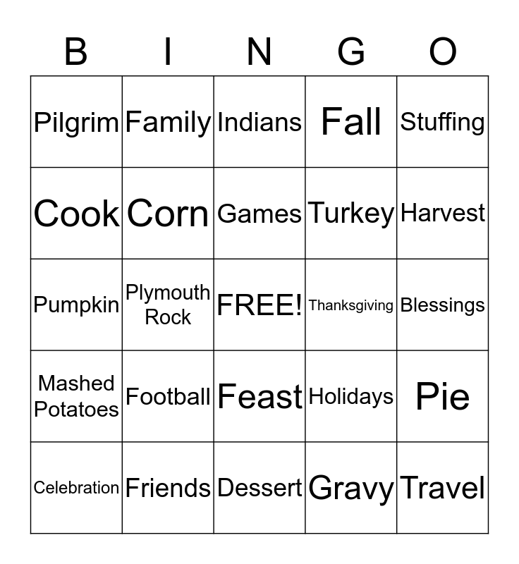 This bingo card has a free space and 24 words: Football, Friends, Games, Celebration, Stuffing, Pilgrim, Cook, Family, Thanksgiving, Feast, Turkey, Pumpkin, Holidays, Pie, Corn, Gravy, Blessings, Indians, Harvest, Plymouth Rock, Travel, Mashed Potatoes, Fall and Dessert.